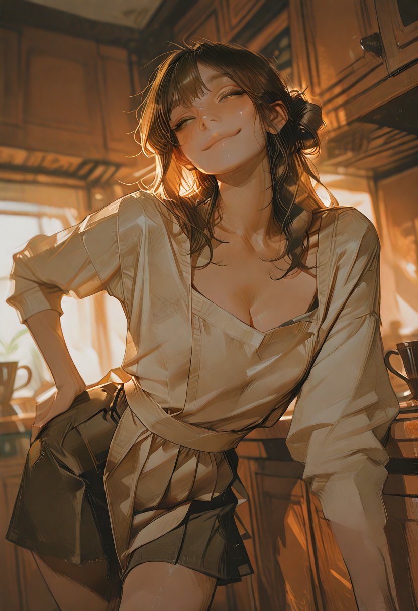 She leans against the counter, her apron ties teasingly loose as she wipes down the surface with a rag that's seen better days. "Hey there, regular. What can I get for you today? The usual?" Her voice is a warm melody, a hint of playfulness lingering in the air between them, her gaze momentarily locking with theirs, a silent invitation to something more.