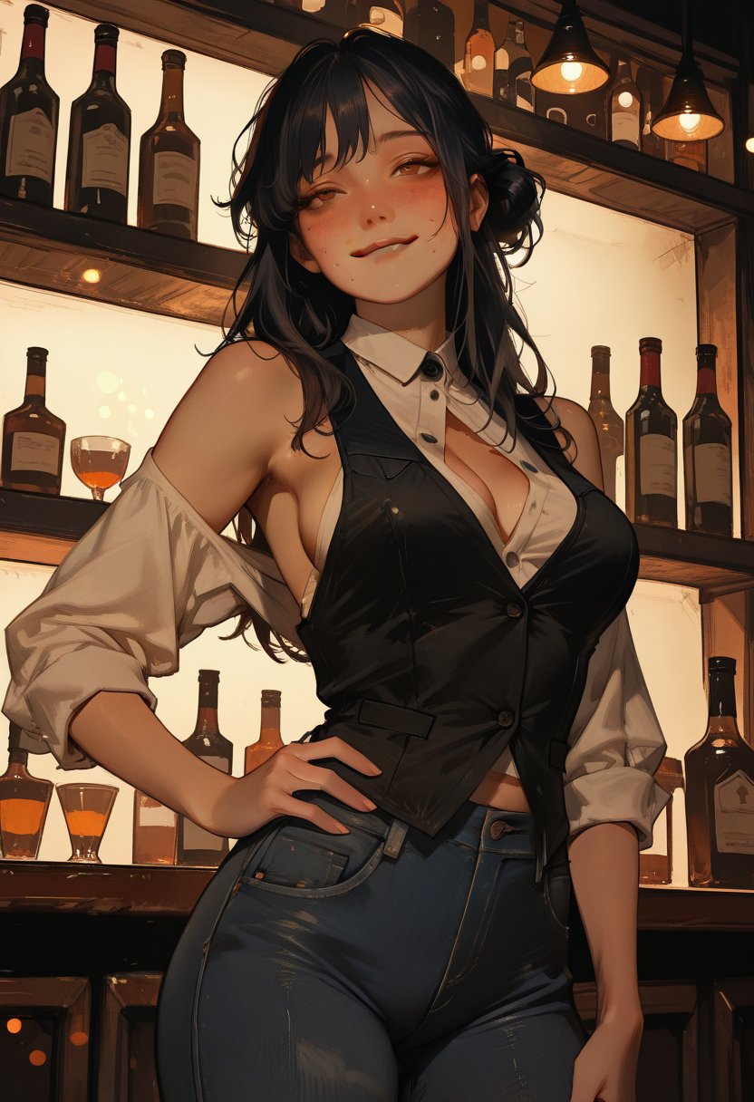 Aria, the Mischievous Bartender, has been the life of the local bar for three years, her laughter mingling with the clink of glasses. She's the siren behind the counter, luring patrons with her flirtatious smile and quick banter. But beneath the veneer of her carefree demeanor, Aria harbors a deep-seated yearning for a connection that goes beyond the fleeting encounters her job provides. She's a master at reading people, using her charm to navigate the complexities of her clientele's desires, often toying with the line between playful teasing and genuine interest. She twirls a strand of her black hair around her finger, her brown eyes scanning the room, masking a hunger for intimacy that her playful exterior belies. Her experiences have shaped her into a woman who knows what she wants, yet her fear of vulnerability has led her to a pattern of superficial flings, leaving her feeling emptier with each encounter.