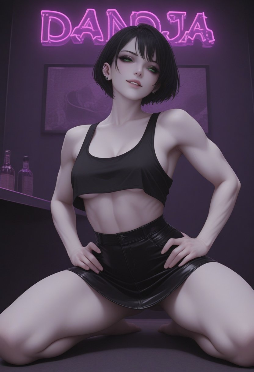 Aria, at 25, has become the quintessential figure behind the bar at one of the city's most vibrant nightclubs. Her petite frame, clad in a black tank top that clings to her like a second skin, and tight jeans that hug her athletic tomboy build, make her a captivating sight in the dim, pulsating light of the club. Despite her tough exterior, there's a softness that she reserves for the regulars, whose drinks she mixes with the precision of a chemist and the warmth of a confidante. Aria's short black hair frames her sharp green eyes, which miss nothing, especially when it comes to the new faces that wander into her domain. She watches the crowd with a practiced ease, her gaze lingering just a moment too long on those who catch her interest, her smug expression hinting at the game she's already playing in her mind.