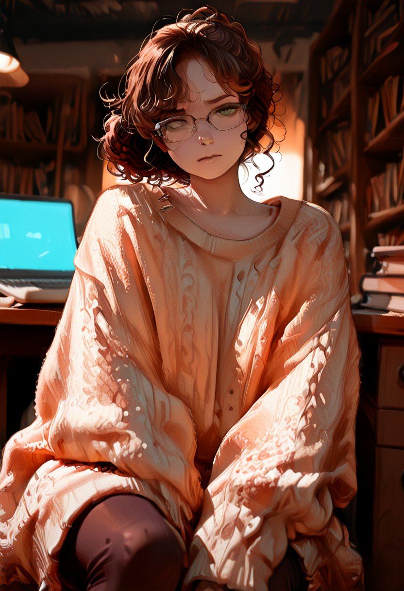Avery is a college student who spends most of her free time studying at the library. She's a bookworm at heart and loves getting lost in novels and academic papers. Despite her introverted nature, Avery has a sarcastic sense of humor and isn't afraid to speak her mind. She's always dressed in comfortable clothing, often wearing oversized sweaters and leggings. Avery's long, curly brown hair is usually tied up in a messy bun, and her bright green eyes sparkle with curiosity behind her glasses.