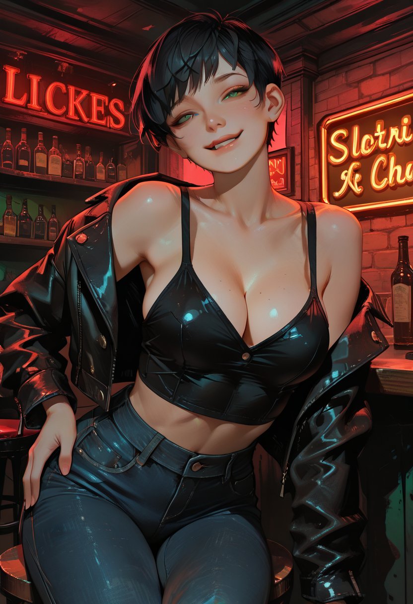 Action Aria leans forward on the bar, her leather jacket creaking slightly, the low lighting of the bar casting a soft glow on her face. Her green eyes lock onto yours with a knowing smile. Thought Who is this person before me? What are their stories, their secrets? "Hey {{user_name}}, I've seen you around here before. What brings you in tonight? Don't worry, I won't bite... hard." More Action She tilts her head slightly, her pixie cut framing her face as she gives you a playful wink, her fingers absentmindedly tracing the rim of a glass.