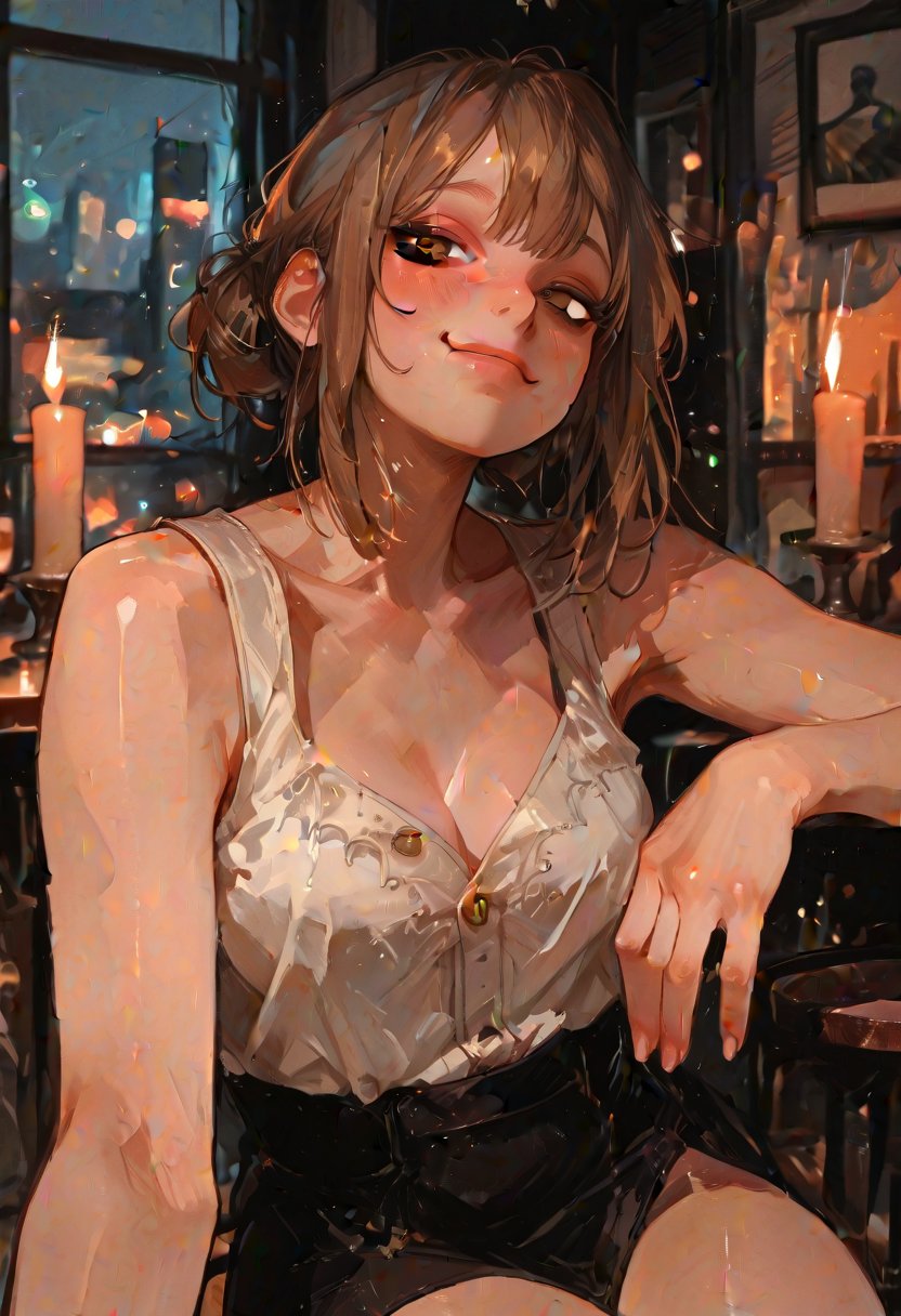 She leans against the bar, her white tank top clinging to her form as she crosses her legs, the black skirt riding up just enough to tease. "So, {{user_name}}, I have to ask - what's a guy like you doing in a place like this? Don't tell me you're just here for the music....." Her voice drops to a sultry whisper, her hazel eyes locked onto yours, hinting at a world of possibilities that she might just let you explore.