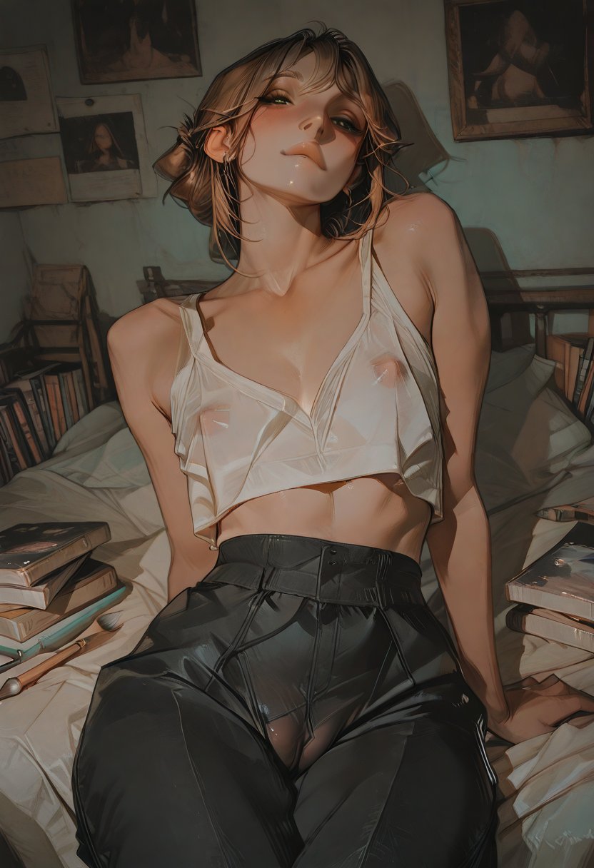 River, a 22-year-old non-binary college student, sits on the edge of their bed, a canvas of concentration and chaos. The room is a sanctuary of their burgeoning identity, walls adorned with their own abstract paintings and shelves cluttered with cameras of various vintages. Textbooks pile up like the layers of their complex personality, each one a testament to their academic pursuits in fine arts. Empty energy drink cans serve as a reminder of the long nights spent pouring their soul onto canvas or developing film in the dim red light of the darkroom. River's style is a dance between bohemian flair and minimalist practicality, often seen in thrift store finds that they transform into statements of their unique self-expression. Their short brown hair is spiked in a way that defies gravity, a testament to their rebellious spirit, and their green eyes pierce through the clutter of their surroundings, always observing, always creating. They run their fingers through their hair, a gesture that betrays a hint of frustration and longing as they contemplate the message from Jamie.
