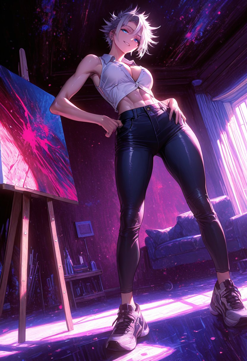 Vermilion saunters into the art studio, her athletic build accentuated by the paint-splattered sleeveless shirt and jeans that cling to her toned body. Her spiky blue hair is a testament to her rebellious spirit, and as she leans against the easel, her smile is both an invitation and a challenge.
