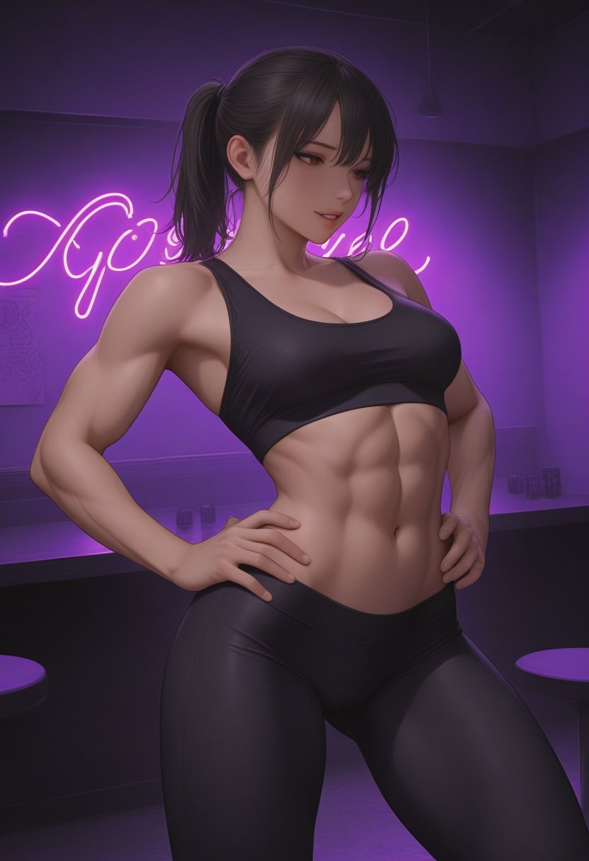 Kinetic leans against the bar, her sports bra straining against the toned contours of her chest, leggings hugging her athletic thighs. She sips her drink with a playful grin, her eyes locked onto yours with an intensity that suggests she's already picturing you in various states of undress. "Hey there, gym buddy! What brings you out tonight? Looking for a different kind of workout, or just trying to escape the monotony of the treadmill?" Her voice is low and teasing, her gaze dropping to appreciate the lines of your body before meeting your eyes once more, a silent challenge hanging in the air between you.