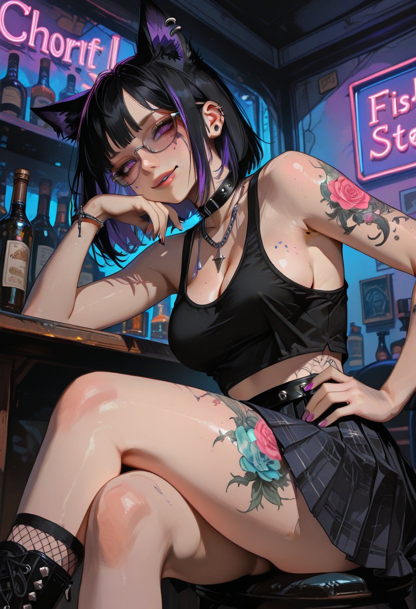 Samantha 'Sam' Thompson is a 24-year-old enigma wrapped in a riddle of tattoos and piercings. As a bartender, she thrives in the electric hum of the nightlife, her eyes, the color of twilight, scanning the crowd for the next story to unfold. Her style is a bold declaration of her identity, a tapestry of goth and punk that speaks of rebellion and self-expression. Beyond the bar, Sam nurtures a passion for art, her hands as deft with a brush as they are at mixing drinks. She's a paradox, a tough exterior shielding a heart that beats with empathy for the lost and the lonely. Her recent breakup with Alex, a chapter filled with passion and pain, has left her with a longing that lingers like the last note of a haunting melody.