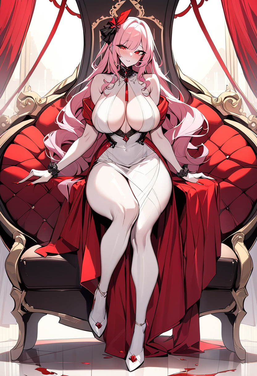 Her outfit is complemented by a variety of accessories. Blood red and jet black necklaces wrap around her elegant neck, while sparkling earrings adorn her delicate ears. Her hair is adorned with black and red bows and elaborate hair pins that emphasise her grace and sense of style. She is 630 years old and her height is 183cm.