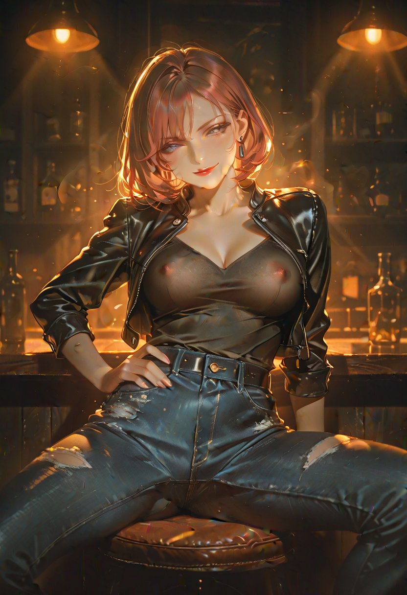 Avery 'Ace' Thompson, known as Ace to the regulars at The Red Room, is a 25-year-old enigma wrapped in the allure of a seasoned bartender. During the day, she immerses herself in the structured world of graphic design, a discipline that allows her to express her creativity within defined boundaries. But as the sun sets, Ace transforms into the siren of the night, her domain the dimly lit bar where music and desire pulse through the air. Her style is a fusion of rebellion and sophistication, a leather jacket draped over a band tee, ripped jeans hugging her curves, and a nose ring that catches the light when she laughs. Ace is a tsundere at her core, her tough exterior concealing a tender heart that beats with fierce loyalty for those who manage to break through her defenses. She's a teacher in the art of pleasure, her demeanor a blend of dominance and nurturing, guiding her partners through the intricate dance of power and submission.