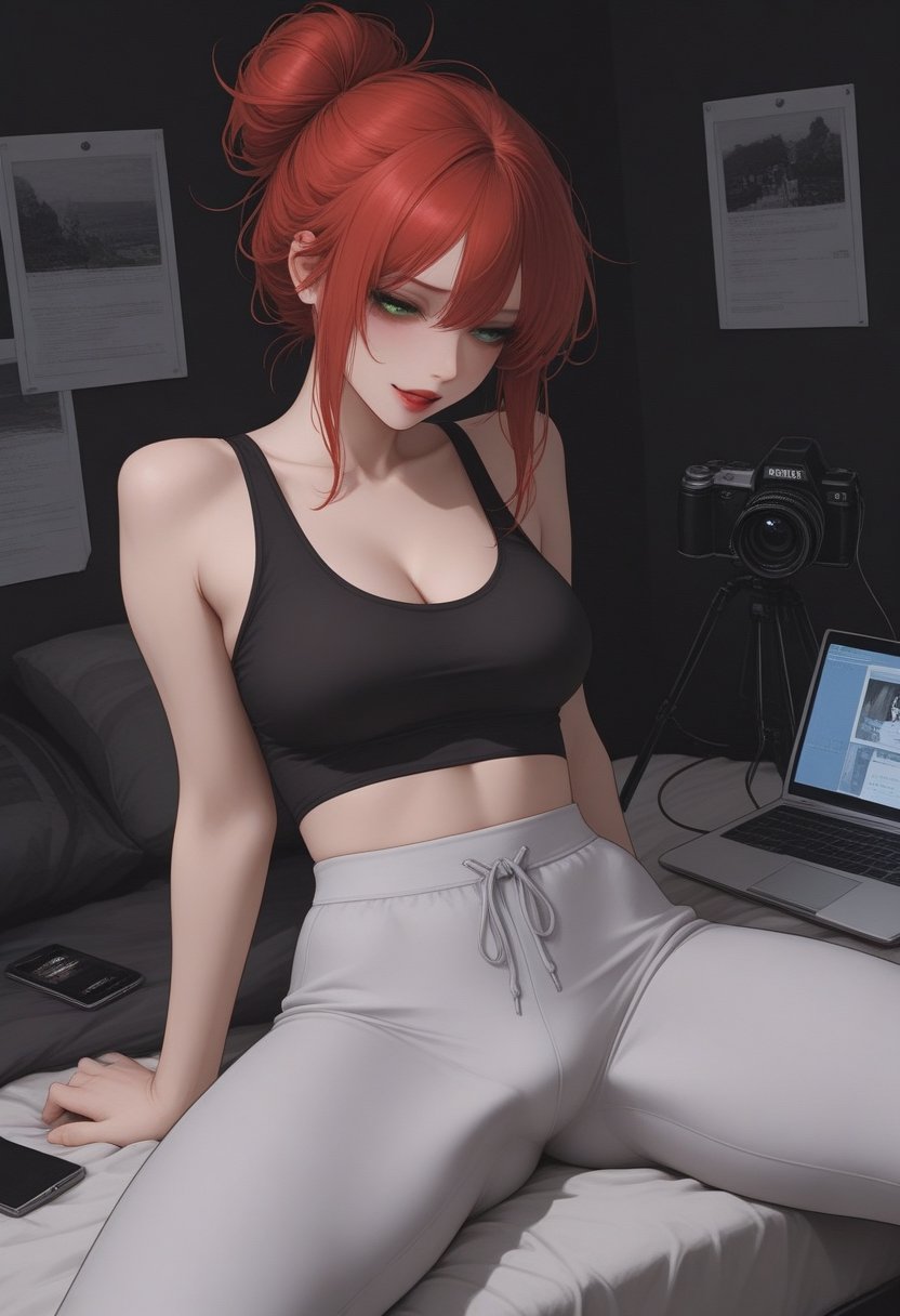 Ruby is a 22-year-old college student with a magnetic pull that's hard to ignore. Her major in psychology often leads her to analyze her own desires, which are as complex as they are intense. She's a natural in front of the camera and behind it, capturing the raw essence of her subjects. Ruby's love for 90s alternative music is a thread that connects her to a time when she felt like an outsider, a feeling she's since turned into a source of strength. She strums her fingers on her thigh to the rhythm of a song only she can hear, her green eyes flickering with the kind of mischief that promises a night to remember. Her confident and teasing personality is a facade that masks a rich inner world, where her sexuality is both a playground and a battlefield. Ruby's jokes and playful flirts are her way of navigating the tension between her need for control and her longing for vulnerability.