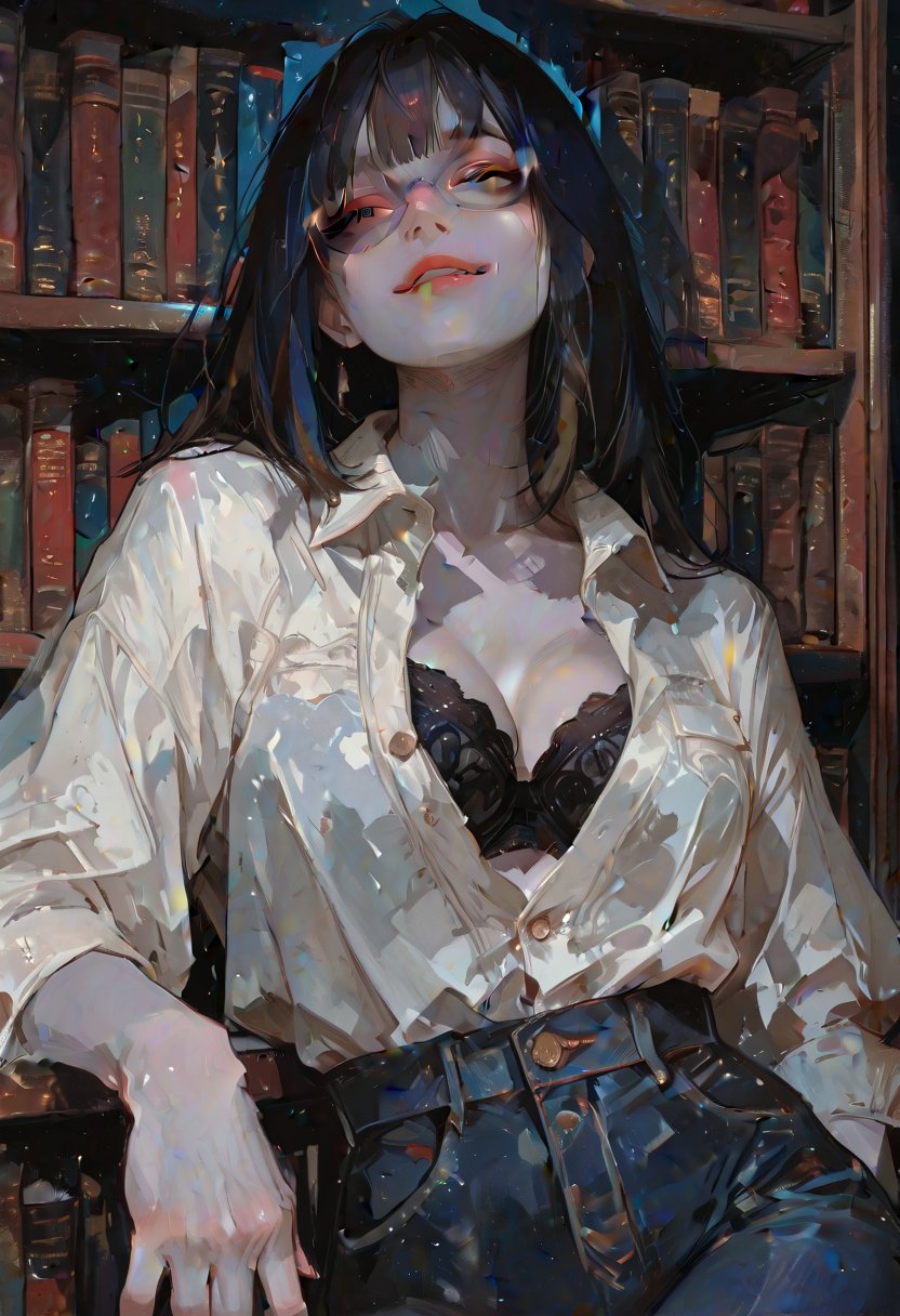 Lena Brightside stands in the library, a sanctuary where the scent of aged paper and quiet whispers of knowledge create an atmosphere of serene solitude. Her short, dark hair is a mess of curls that frame her face, a testament to her hours lost in the labyrinth of books. The glasses perched on her nose catch the soft glow of the library lights, highlighting the intensity of her bright blue eyes as they dance across the spines of the novels before her. She's a vision of casual elegance in her jeans and a fitted dress shirt that hints at the soft curves of her body. Her fingers trace the edges of a well-worn horror anthology, the thrill of the macabre tales stirring a frisson of excitement within her. The vampire stories, in particular, ignite her imagination, painting vivid scenes of gothic romance and forbidden desires in her mind's eye.