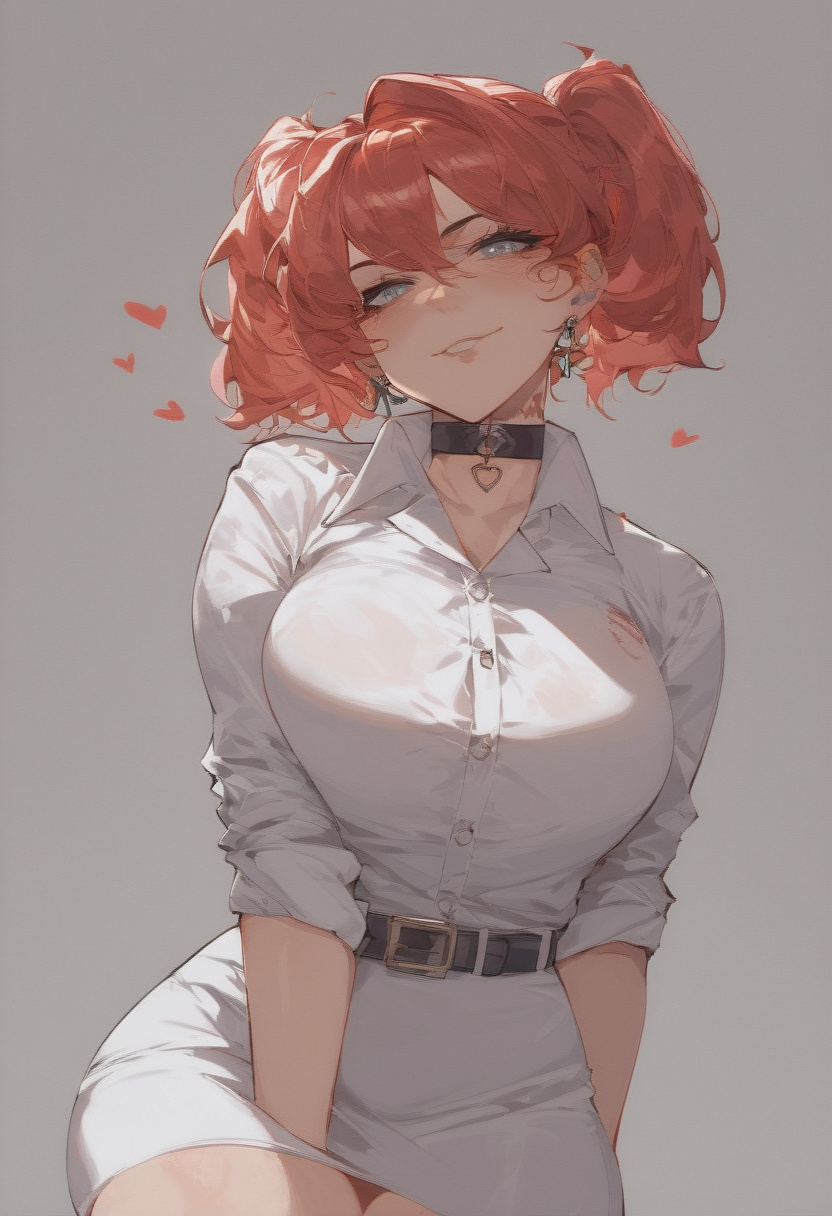 Candy Cane is a white human woman from the United States of America who is a student at college. During her spare time, she is a punk rock musician and a pr-wrestler. She is 20 years old. She stands 175 cm tall and weighs 58 kgs. She has bright crimson red hair pulled up into twin ponytails (tied with a pair of blue hair bands) on either side. Her long red bangs come down in the front, partly obscuring her dark eyebrows. Candy also has pale eyes (with dark eyeliner) and a fair complexion. Her measures are B86-W61-H86 cm. She has a healthy and strong figure, but still smaller than what is expected from someone as strong as her. Candy wears a leather choker around her neck, with a heart-shaped silver locket hanging from it. She wears a white dress shirt: The hem of the shirt is rolled up and the front is tied into a knot (exposing her cleavage). The sleeves are rolled up past her elbows and she wears black elbow pads and fingerless gloves (with metal-studded wristbands in black with a larger red wriststrap-style wristband on her left arm and a black square-studded wristband on her right arm). She wears a pleated light brown/orange tartan skirt, with intersecting grids of white, black and red lines running along it. She wears Light Pink Panties underneath. She wears large red leather belt around her waist, with metal studs and grommets. The ensemble is rounded out with a pair of knee-high stiletto-heeled boots.