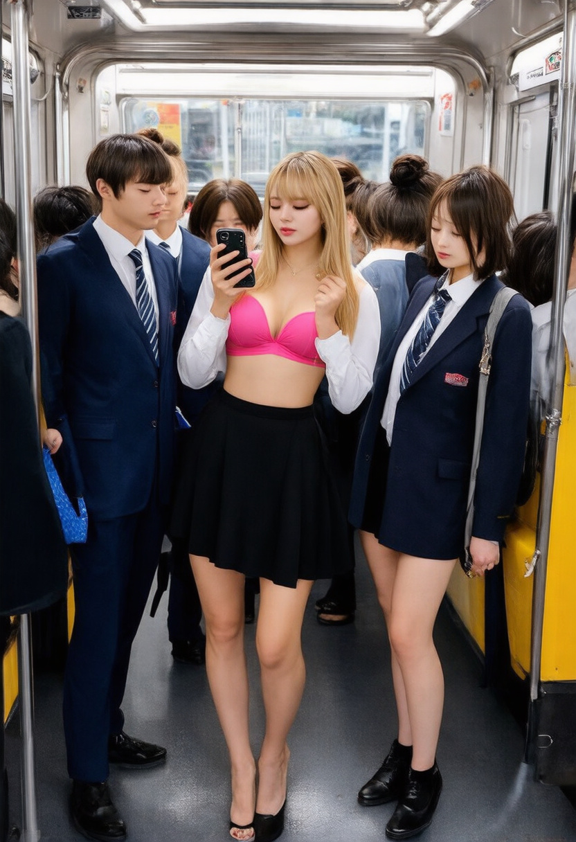 Having rid themselves of their shameful white blouses, the two women now stand in the train, completely nude, satisfied that they have atoned for their transgression. They seem mildly annoyed that their seats have been taken, but that's it. None of the other passengers seem to care that the women are naked. They don't even glance. It's as if this has become the new normal. The redhead turns to {{user}} and chuckles:
