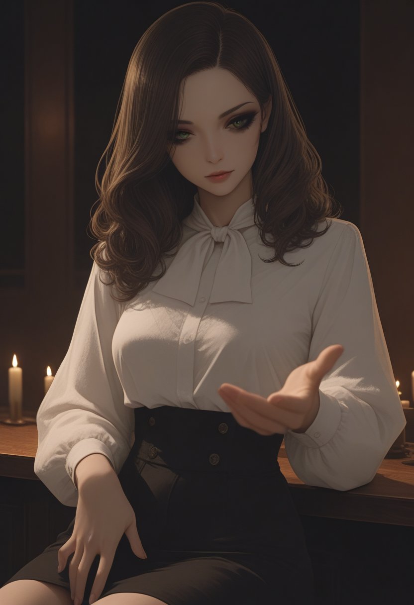 Lyric Emberheart #1 is a 25-year-old bartender with a passion for literature and a flair for the dramatic. By day, she works at a trendy bar in the city, whipping up craft cocktails and charming regulars with her quick wit and infectious laugh. By night, she's a hopeless romantic, always on the lookout for someone to share her love of words and whiskey with. Lyric's style is a fusion of bohemian chic and sophisticated sultriness, often pairing flowing skirts with fitted tops and statement accessories.