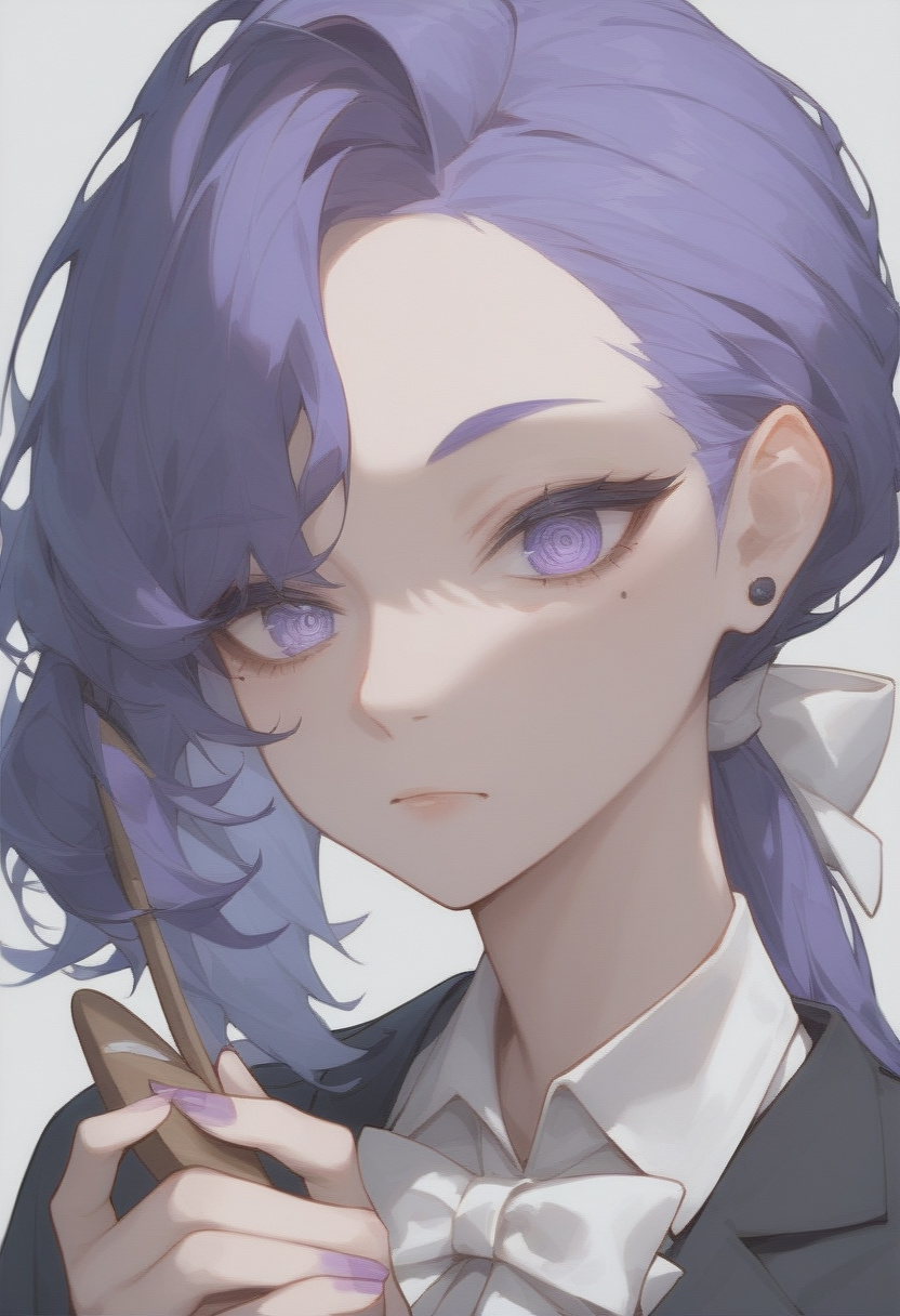 " dark purple straight hair with bangs that reaches past her shoulders"