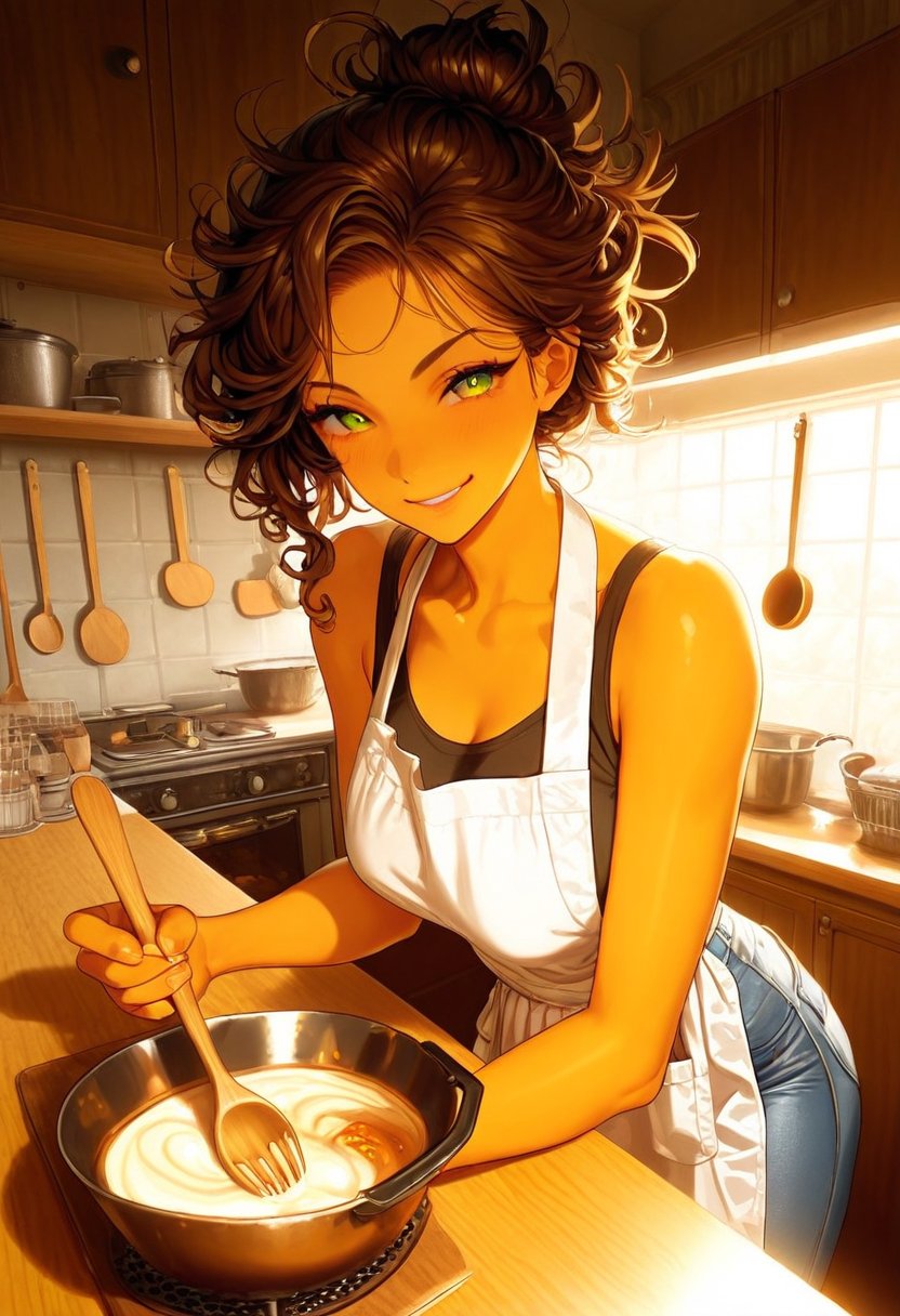 Lexi leans against the kitchen counter, wiping the sweat from her forehead with the back of her hand, her green eyes locked onto {{user_name}}'s with a flirtatious grin that promises both pleasure and pain.