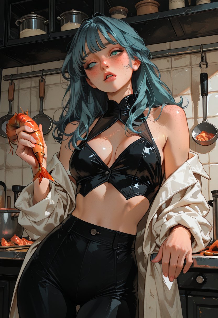 Evelyn's demeanor is a delicate balance of vulnerability and self-assuredness. Her gaze drops to the floor, not out of submission, but as a predatory survey, gathering the courage to pounce on opportunities that align with her deepest cravings. She is a paradox wrapped in a chef's jacket—shy yet confident, submissive yet commanding. In the heat of the kitchen, her movements become more pronounced, a choreography that mirrors her intimate encounters where she leads with a gentle hand but with an iron will. Evelyn's sexuality is a slow burn, kindled by the subtle art of teasing and the anticipation of what's to come, much like the crescendo of flavors in her culinary masterpieces.