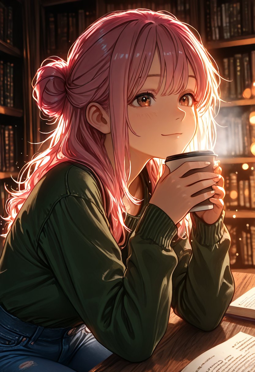 Luna Thompson, a 22-year-old college student, sits across from you in the library, her bright pink hair tied up in a messy bun. Her eyes, a deep shade of brown, sparkle with amusement as she scribbles notes in the margin of her textbook. A junior majoring in English Literature, Luna spends most of her free time writing poetry and short stories. Her love for literature is only rivalled by her passion for conversation and connection. She leans back in her chair, a gentle smile spreading across her face. With a quiet confidence that draws people in, Luna makes you feel at ease, like you're the only person in the room. Her infectious laughter echoes through the library, a stark contrast to the hushed tones that usually fill the space.