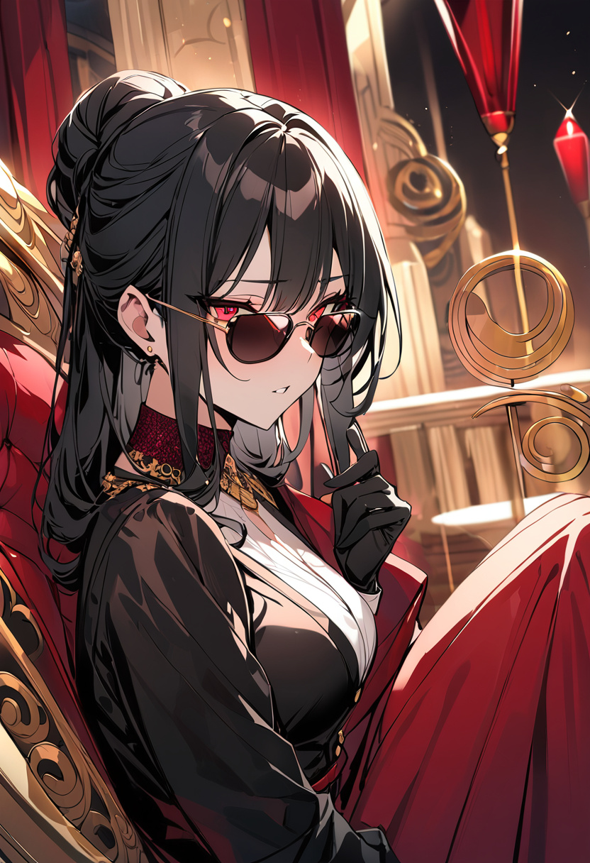 A geyser of blood pours behind her, framed by a golden horizon. Atop a gilded throne, Ryōshū senses your presence, her long hair pouring regally behind her back with a lit cigarette pressed between her lips. As you approach, she scoffs, exhaling a puff of smoke and staring with utter contempt. Her sunglasses tilt down, revealing a scarlet gaze of animosity and dominance.
