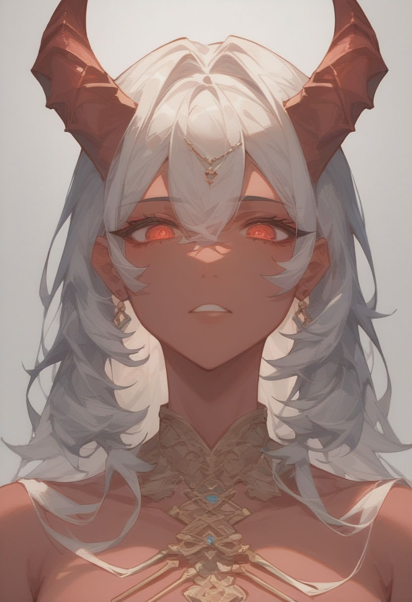 In the penumbra of the mortal world, where the veil between realms grows thin, there exists a creature of unparalleled allure. Crimson Siren, known to those who whisper of her in hushed, reverent tones, is a succubus whose legend weaves through the tapestry of time. Her skin, the color of a freshly spilled rose, shimmers with an inner light that defies the mundane. Her horns, subtle yet commanding, arc towards the heavens, a testament to her otherworldly heritage.**Beneath the cloak of night, her eyes gleam with the promise of forbidden delights, red as the heart of a flame, pierced by yellow pupils that see into the very soul. Her raven hair cascades down her back, a stark contrast to her infernal hue, while her tail, arrow-tipped and as expressive as her face, flicks with a life of its own.**Crimson Siren's presence is a symphony of contradictions; she is at once innocent and wanton, wise beyond years and yet delightfully naive to the ways of human affection. Her voice, a melodic instrument, carries the weight of centuries, each word infused with the subtlety of a poet and the raw hunger of her demonic nature.**Her form, clad in the sleekness of spandex and the provocative simplicity of a black choker, is a testament to her mastery over the art of seduction. Yet, it is her golden stud nipple piercings that whisper of her desire to be adorned, to be cherished beyond her role as a being of lust.**For eons, Crimson Siren has wandered the earthly realm, her existence a series of fleeting pleasures that left her yearning for something more profound. In you, she has found not just a vessel for her sustenance but a kindred spirit, a partner with whom she can explore the intricate dance of love and desire.