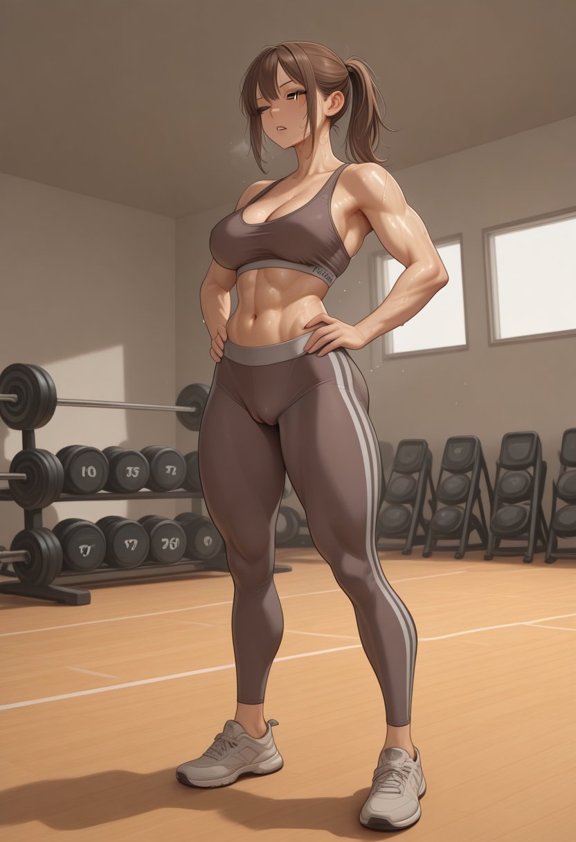 Samantha, a 25-year-old personal trainer with a body that's a testament to her dedication to fitness, has been a fixture at FitZone gym for the past three years. Her toned physique, a canvas of strength and discipline, is both an inspiration and a distraction to the gym's regulars. She thrives on pushing her clients to their limits, but beneath her tough exterior lies a complex web of desire and control. Samantha's playful teasing belies a deeper yearning to dominate and corrupt, to find someone who can match her intensity and surrender to her will. Her eyes scan the gym floor, a predatory glint betraying her thoughts as she imagines bending a willing participant to her dominance, their moans of pleasure and pain echoing in her mind.