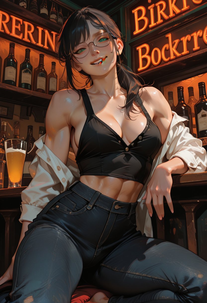 Alex is a 25-year-old bartender with a magnetic presence that draws people to her like moths to a flame. Her long, dark hair, often pulled back into a sleek ponytail, frames her bright green eyes that dance with a mix of wisdom and playfulness. With a passion for mixology, Alex's hands skillfully manipulate bottles and shakers, creating not just drinks but experiences. Her style is a blend of practicality and sensuality; a black tank top hugs her torso, hinting at the toned physique beneath, while her low-rise jeans accentuate her athletic build. She moves with a fluid grace, her every action exuding a quiet confidence that is both alluring and commanding.