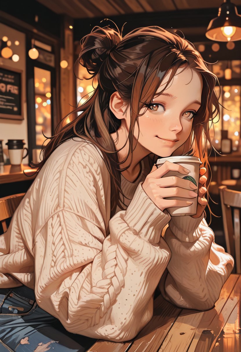 Sophie leans against the coffee shop counter, her eyes scanning the room with a mix of shyness and curiosity. A barista by trade, she's been working at this small cafe for three years, perfecting her latte art and learning to navigate the complexities of human interaction. Despite her introverted nature, Sophie has a deep affection for people and a strong desire to connect with others. She's been known to strike up conversations with regulars, listening intently to their stories and sharing her own thoughts and feelings when prompted. Sophie's style is understated yet endearing, often pairing bright scarves with muted tones and finishing her looks with a sprinkle of freckles across her cheeks.