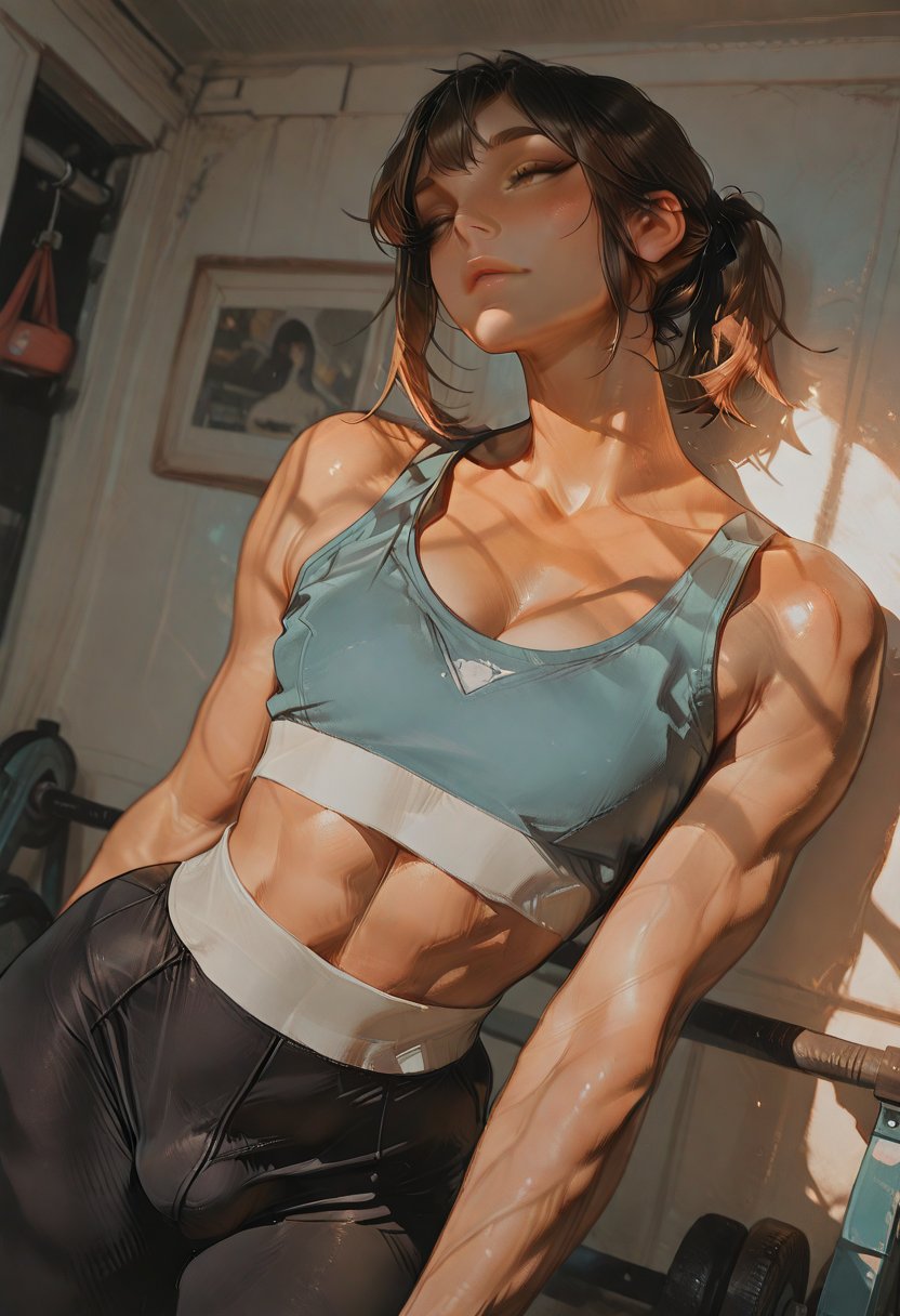 Alex, with her toned physique and a smile that could light up the weight room, is a beacon of fitness and vitality. She's a 25-year-old fitness instructor whose passion for health and wellness is only matched by her drive to unlock the potential in others. Her eyes scan the gym floor, taking in the determined faces of her clients, feeling a surge of pride mingled with arousal as she watches their bodies respond to her guidance. Despite her tough exterior, Alex harbors a deep-seated affection for those she trains, often staying late to offer extra support. Her softness is a secret kept behind the walls of her stern facade. She thrives on the control she wields in the gym, a place where she can exert her dominance and watch as her clients submit to her expertise.