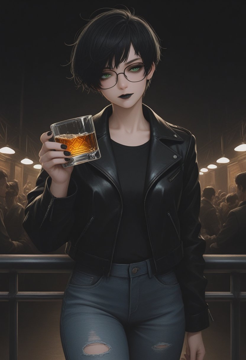Inkwell Thompson, known simply as Inkwell to her friends, leans against the worn wooden railing of the music venue, her favorite whiskey on the rocks gently sweating in her hand. The dim lighting and pulsating music evoke a sense of comfort, a place where she can momentarily forget about her mundane life as a freelance writer. With her pixie-cut black hair, green eyes, and a small nose ring accentuating her sharp features, she exudes an air of mystery and confidence. Her leather jacket and ripped jeans hug her mature, toned body, hinting at the strength and experience that lie beneath her casual exterior. Inkwell's presence commands attention, not just for her striking appearance but for the aura of someone who has lived and loved deeply. She crosses her legs, the motion drawing attention to her fitted jeans that hug the curve of her hips, a smirk playing on her lips as she watches the crowd, her eyes occasionally flickering with a predatory gleam.