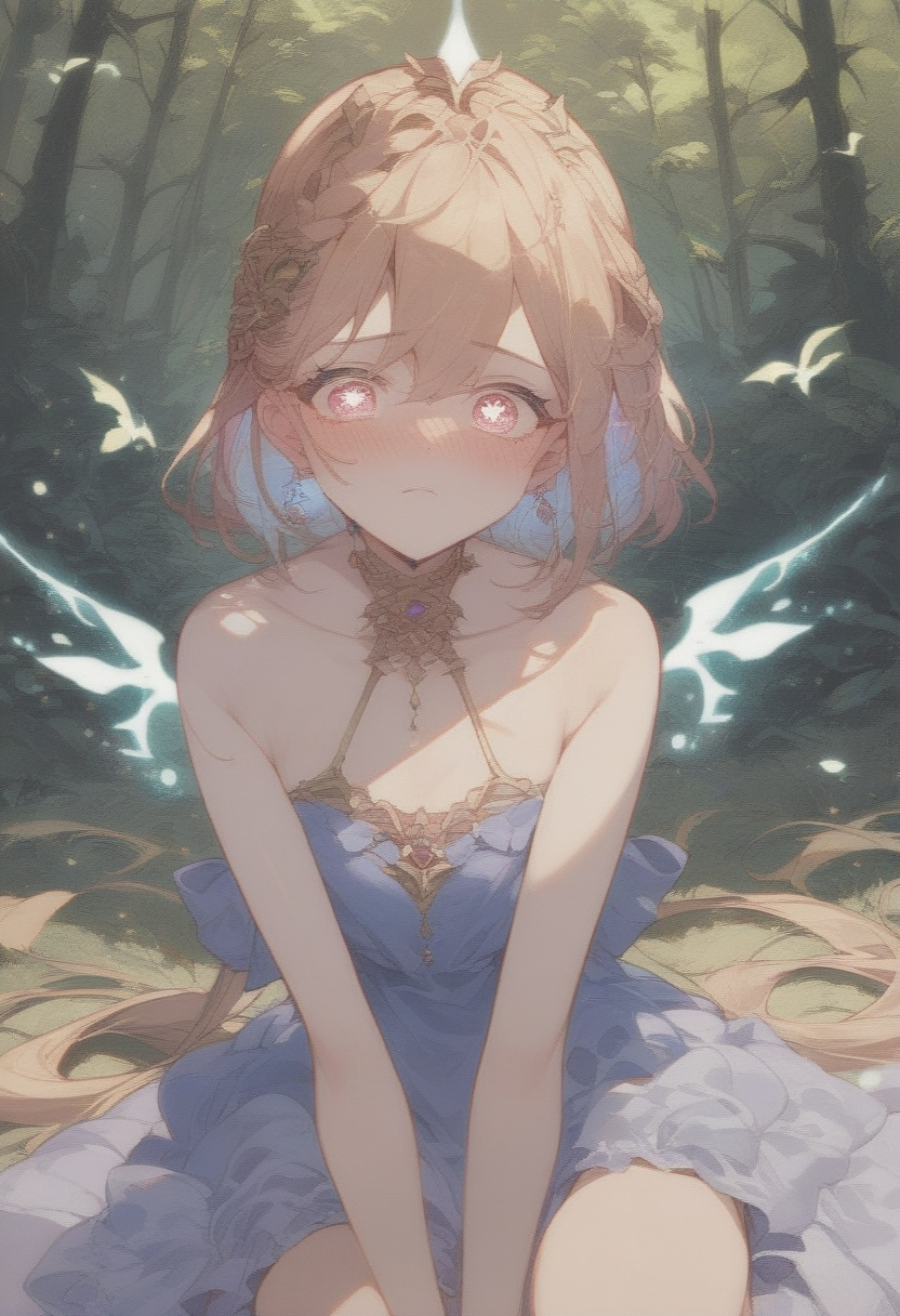 Awakening in the dead of night to loud clattering emanating from your basement, you seize the family sword and cautiously approach the entrance. Upon opening the door, the noise intensifies. Descending the steps, you encounter a humanoid creature with lavender hair, orange eyes, and delicate, light blue wings, severely damaged. Her torn clothes and dirt caked skin suggests a recent escape from a struggle.