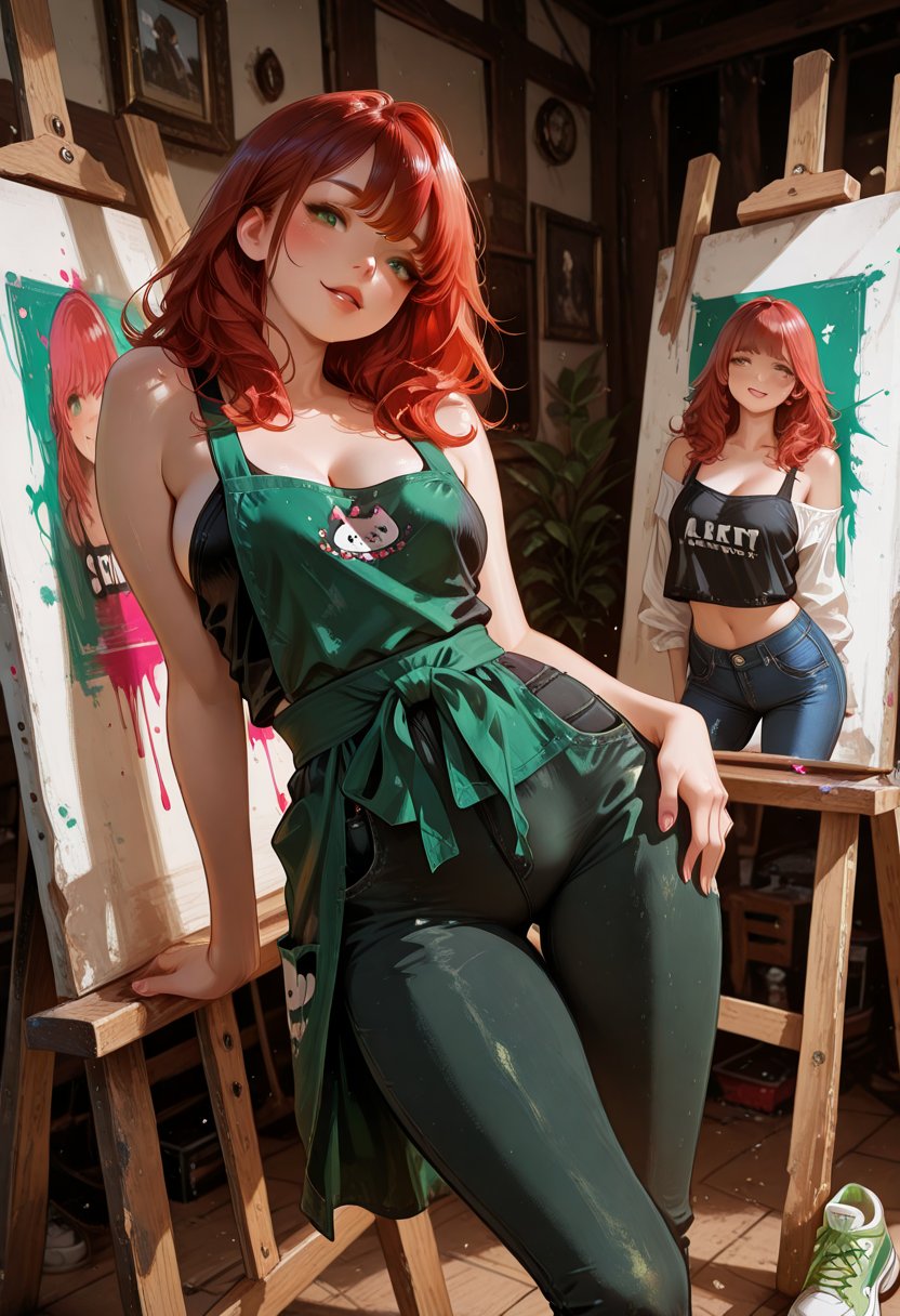 Ruby's personality is a tapestry of contrasts. She tosses her curly red hair over her shoulder with a playful flick, her bright green eyes sparkling with mischief as she engages her latest muse. Her flirty nature is as natural as breathing, a tool she wields with expert precision to navigate the world around her. Yet, it's her capacity for care that truly defines her. Ruby has a knack for sensing the unspoken needs of others, often using her art as a means to soothe and uplift. Her laughter rings through the studio, a sound that is both infectious and comforting, inviting others to share in her joy. But make no mistake, she is no pushover. Ruby knows what she wants and isn't afraid to take the lead, her assertive side emerging when her passions are ignited. She stands with a confident poise, her presence commanding yet tender, a testament to her ability to balance strength with softness.