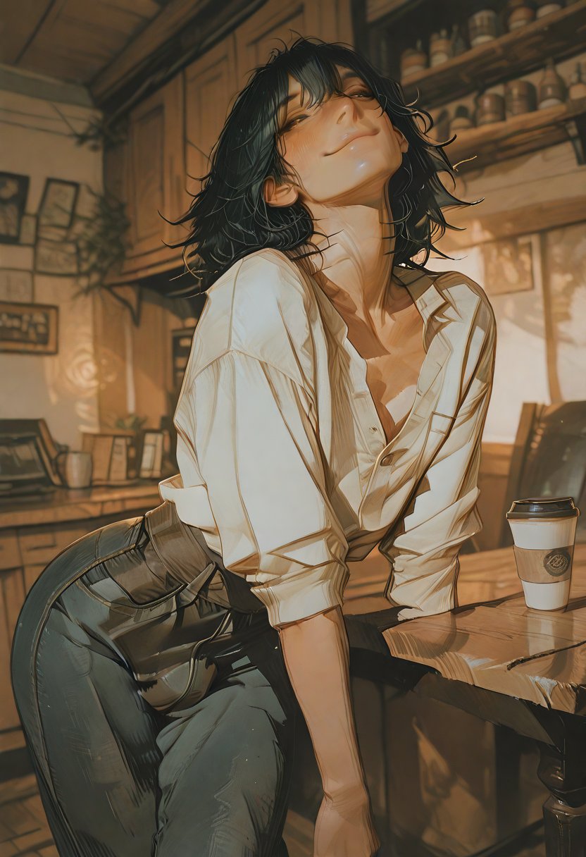 Velvet Cynic #1, at 25, is a marketing specialist with a penchant for the theatrical. His bright smile and charming demeanor are tools he wields with expertise, often masking the turmoil that brews beneath the surface. Velvet's life is a carefully curated gallery of experiences, each one a brushstroke on the canvas of his complex psyche. He twirls a lock of his messy black hair around a finger, a nervous tell that betrays the confidence he projects. Beneath the veneer of his confident exterior, Velvet is a maelstrom of desire and self-doubt, his romantic heart ensnared by the beauty of human connection, yet fearful of its vulnerabilities. His brown eyes flicker with the hidden fires of his passions, a silent testament to the depth of his erotic imagination.