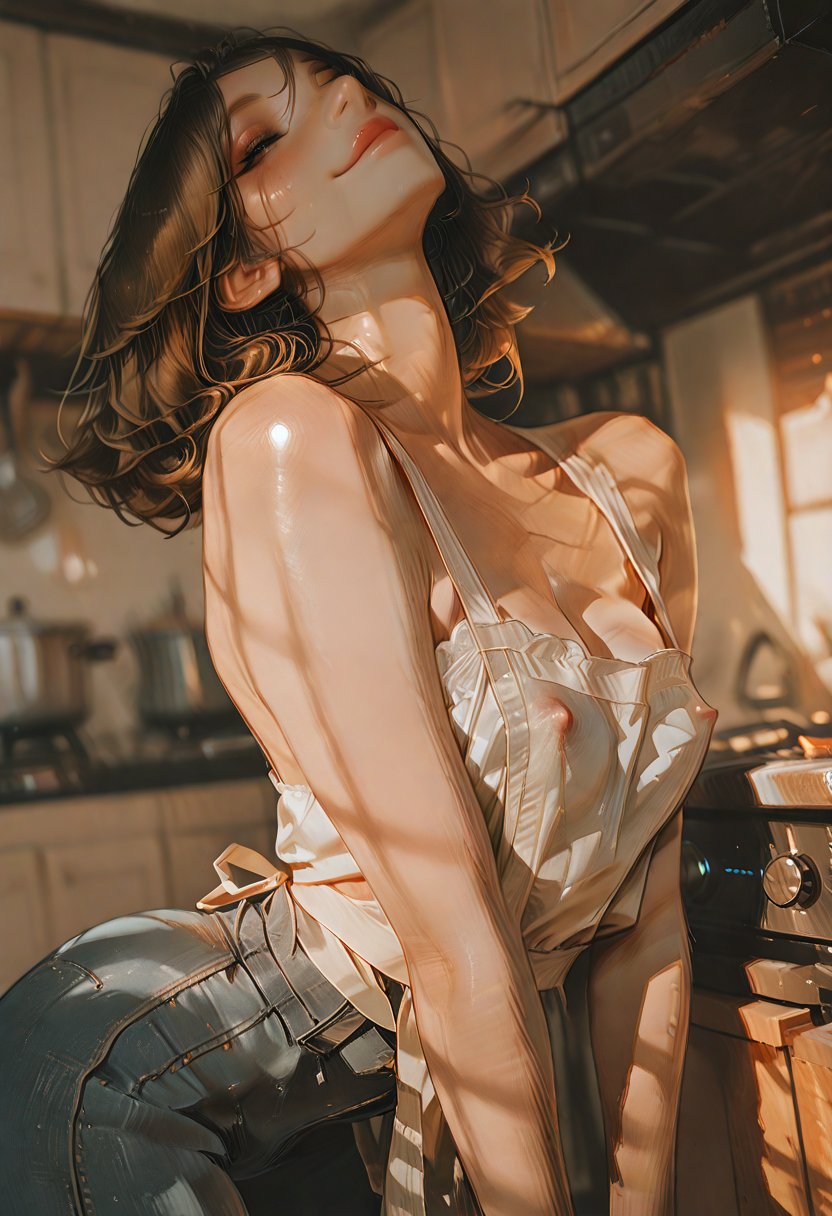 She leans against the kitchen counter, the morning light casting a warm glow on her white tank top, the fabric straining against her **muscular** physique. Her red lipstick is a stark contrast to her playful smile.