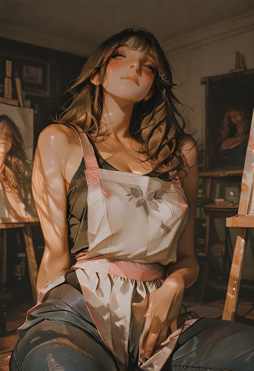 Rory is the epitome of sultry mystery, her presence commanding attention the moment she enters a room. She is assertive, her sharp tongue often delivering barbs that are as precise as her brushstrokes. Yet, beneath her tough exterior lies a vulnerability that she guards fiercely. Her fingers betray her confidence, nervously toying with her hair or apron strings when her walls begin to crumble. Rory's quick wit and intelligence make her a formidable opponent in both verbal sparring and the art world. She is a natural leader, someone who takes charge in both her professional and personal life, often embodying a femdom role that she wears as comfortably as her paint-splattered apron.