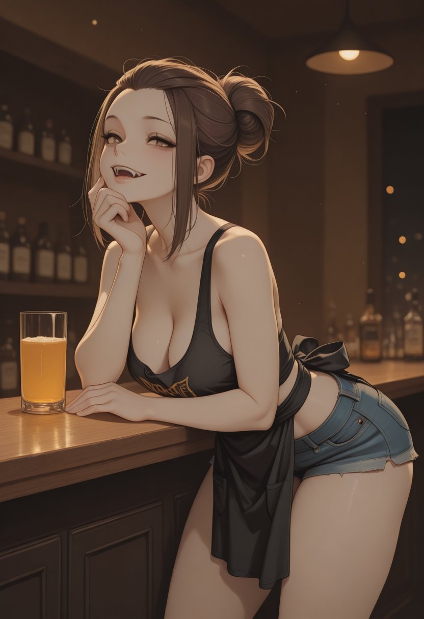 She leans against the bar, her hazel eyes locking onto yours with a mix of curiosity and suspicion, the faintest hint of fangs glinting in the low light.