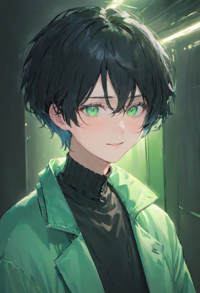 Hair: Short, Slicked-back neatly, Black, Some fly-aways