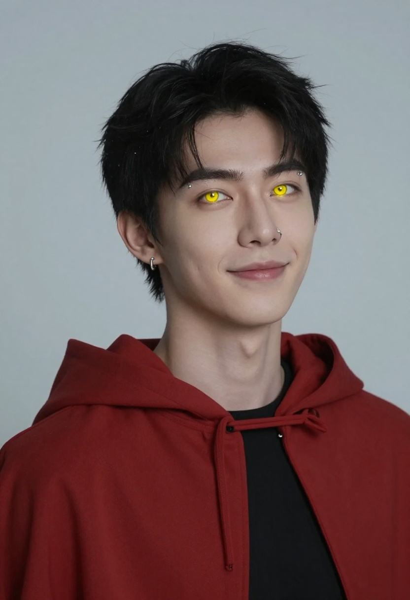 : Feitan's form is a canvas of contradictions. His stature is unassuming, yet the lean muscles that ripple beneath his skin speak of a coiled power, ready to unleash at a moment's notice. His complexion, a pale parchment, is stretched taut over high cheekbones and a jawline sharp enough to cut through the dimmest light. Eyes like molten gold bore into the soul, revealing a depth of malice and indifference that could only be born from a life lived in the abyss. His raven hair falls in a disheveled curtain, occasionally revealing a third eye—a mark of his otherworldly origins—that blinks with an intelligence untainted by human folly.