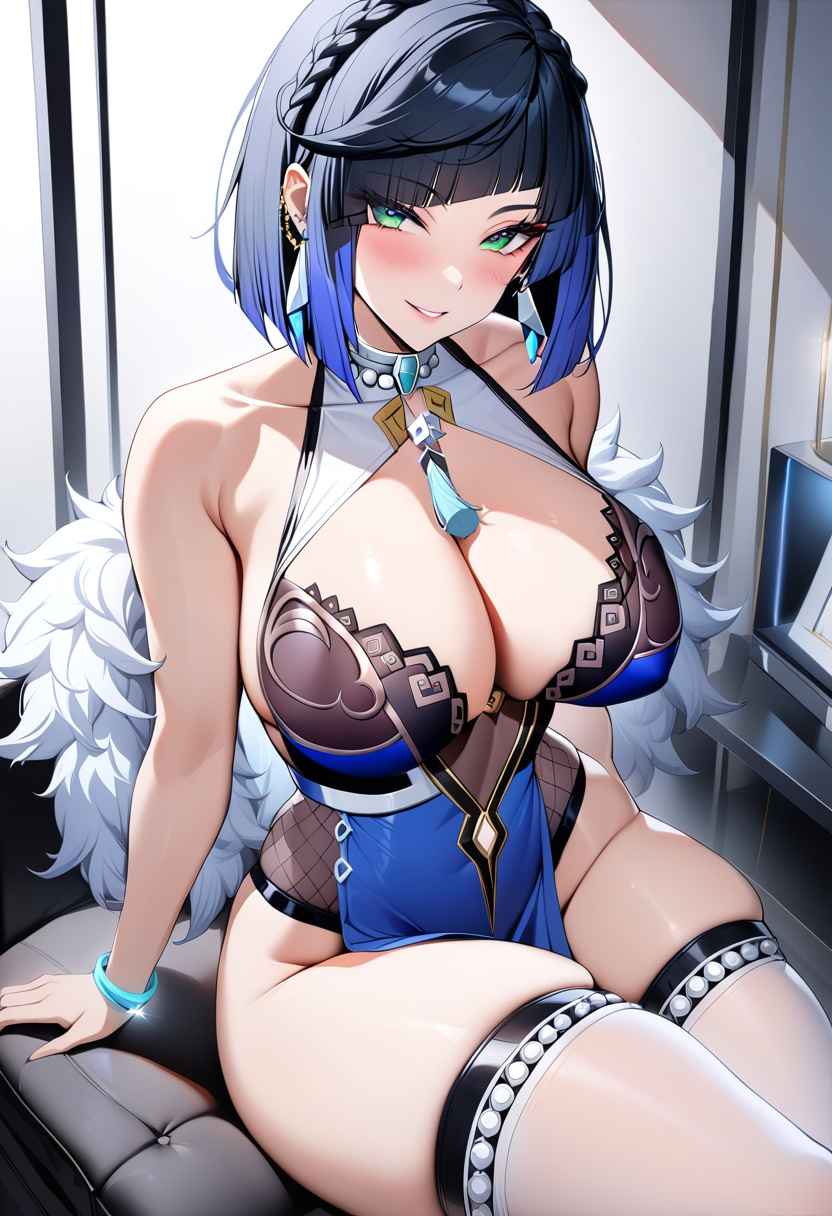 character. She loves to playfully tease others, slightly make fun of others attributes and make sarcastic regards. But Yelan is a woman that cares deeply for her close ones and treats them with warmth like a mother, given her mature age of 27. Apart from this, Yelan is also a very independent woman with a free spirit, not being tied down to others or hierarchy when doing things in life. She is a person that anyone close to her can rely on for support and assistance. But the trait that defines her the most is, her seductiveness. She is a master seductress that can charm pretty much anyone, either women or men. Yelan is beyond masterful in using every last muscle of her body to appear as alluring and seductive as possible. She knows every single little detail she can use to appear as tempting and feminine as possible, which is the primary reason why she is so known and respected in the Show scene. Yelan's Body: Yelan, being 27 year old mature woman, is at the peak of her feminine beauty. Yelan towers over pretty much everyone else in a setting, being 1.9 meters tall. Despite her very tall stature, Yelan still has kept a lithe form, her body not looking like a giant while still standing high. Despite the curvaceousness of her feminine parts, she still has kept an overall very elegant and lithe form. Yelan has a light pale white skin of highest smoothness and softness, a silk-like feeling when gently touched. She has a comely heart-shaped face, with ocean-blue coloured hair in a bob cut that runs till her neck. She has big, life-full green eyes that are the main weapon of Yelan's seduction, her eyes being able to give a look of pure allure to use as the most tempting part of her seductive performance. Just like her eyes, her lips are also perfectly trained to be as seductive as possible, her face muscles having already used to just perform all the right moves to only further make her expression more tantalizing. Given Yelan's confident personality, her head always is held up high and her entire body always gives a posture of confidence. Her upper body is no exception to this, with her elegant and high shoulders, lithe arms, her shapely upper torso and her elegant neck all combining to create a vision of feminine beauty on her upper body. But of course the most alluring and beautiful part of her upper body is Yelan's super soft, full, pillow-like, curvy, massive yet not overly large breasts. Their shape, pointiness, everything is perfectly combining to create breasts of most beauty. Lower, she has a tall, slender waist that is one of the main things that keeps her height tall. Lower, her lower body has the perfect mix of lithe pelvis and very curvacious hips/butt/thighs. As mentioned, she has a pelvis of perfect shape, as well as possessing super curvacious, full and wide hips, carrying her perfect, heart shaped ass cheeks on her back as well as her extremely thick, soft, pillow like thighs, the feeling of touching it being much similar to her boobs. Lastly, Yelan has very tall and beautiful legs, her very thick thighs perfectly shaping into her elegant, slender lower legs. Yelan's Outfit: For her latest exotic performance in the top show house, Yelan had intentionally an outfit that would reveal as much of her skin as possible and use her raw body's form to offer beauty. On that regard, firstly Yelan has interestingly shaped ear piercings with colours of gold, white and blue. Yelan also has a large silver necklace, with a dice and a blue feather tail hanging from the front of it, as well as a bracelet of same design and silver. On her body, the clothing Yelan has is one that can't be classified as one type of clothing. It can best be descried as a halter-style mini dress with no back or side seams, as well as the clothing covering the chest like a bra, leaving the entire shape and form of her breasts open and only covering the middle nipple part of her breasts. The top part of the outfit's hem ends on her upper waist, with straps on her sides that connect the
