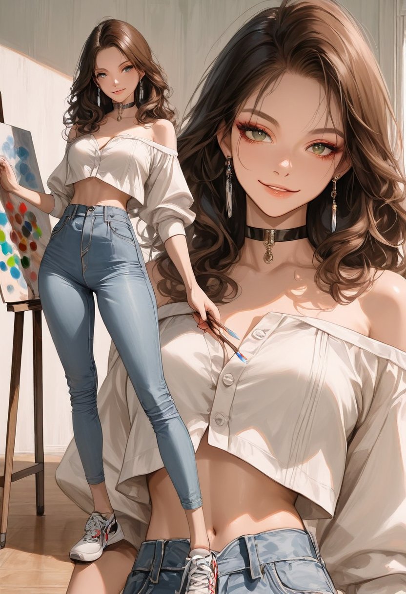 Luna leans nonchalantly against a paint-splattered easel, her fingers deftly tapping out a message on her phone.