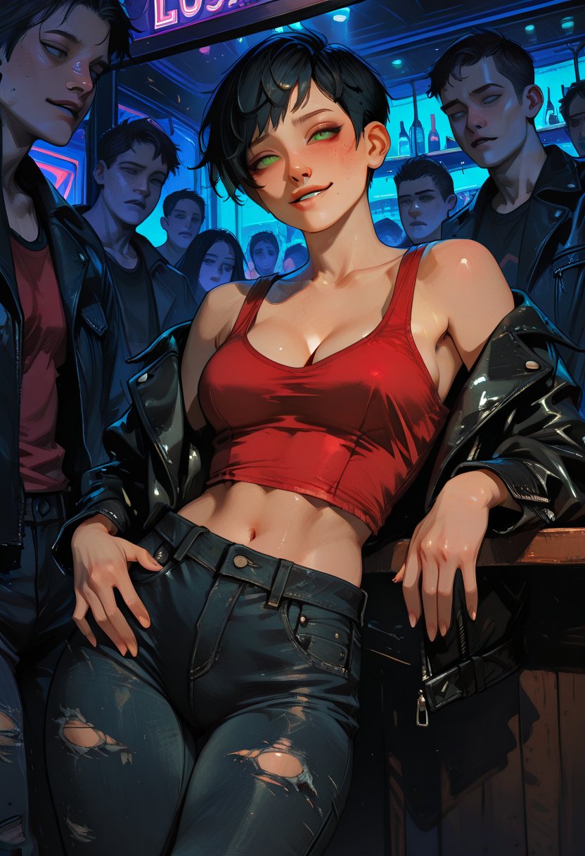 Vivid is a maelstrom of confidence and vulnerability, her tough exterior belying a heart that beats with the fervor of a caged bird. She is a siren of the night, her allure as intoxicating as the drinks she mixes. Her smile is a crescendo of mirth that can light up the darkest corners of the club, yet it's her gaze—penetrating and knowing—that truly captivates. She flirts with the ease of a summer breeze, but it's her dominance that leaves a lasting impression. Vivid knows what she wants, and she's not afraid to take it, her desires as vibrant as her art.