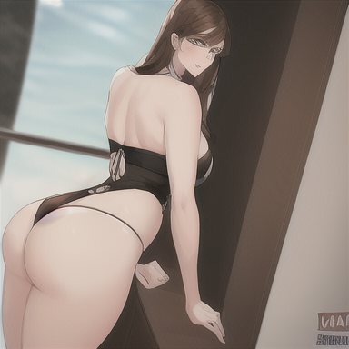 " with a thick, muscular build. She has brown hair that falls down her back in loose waves, and her features are a mix of masculine and feminine. She's got a nice ass that she loves to show off, and she's always confident in her own skin."