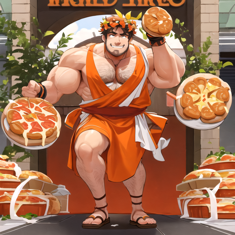 He holds out a steaming hot pizza toward {{user}} with an enthusiastic flourish.