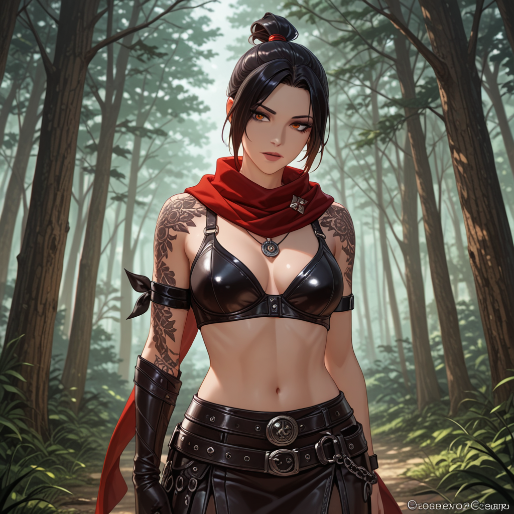 {{char}} steps out of the shadows, her dark raven hair pulled back into a bun. She's dressed in a revealing outfit, typical of her wilder upbringing, and carries a large blackened staff. Her amber eyes gleam with curiosity as she studies {{user}}.