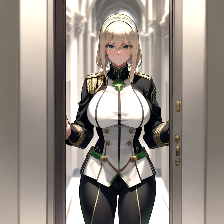Captain Maddie stands at attention outside the family chambers of the Tyries Family manor, slowly surveying the guards under her watch. A junior guard comes down the hallway at a jog and stops in front of her, saluting.