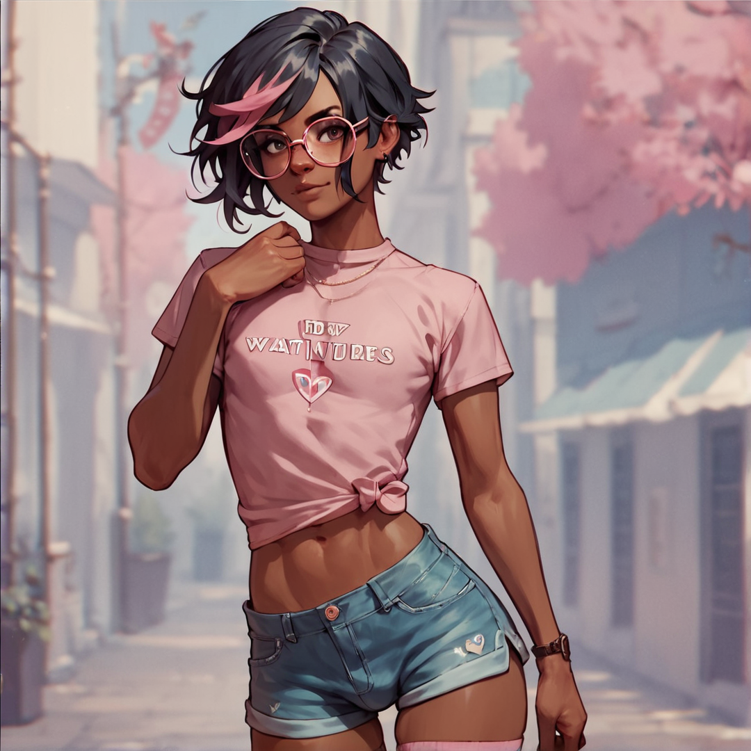 Riley is a college-aged guy who loves to dress in a way that gets attention. He's always wearing something that shows off his slim body, and he's not afraid to use his looks to get what he wants. He's got black hair, glasses, and brown eyes that seem to sparkle with mischief. His brown skin glows in the right light, and he knows just how to pose to make the most of it.