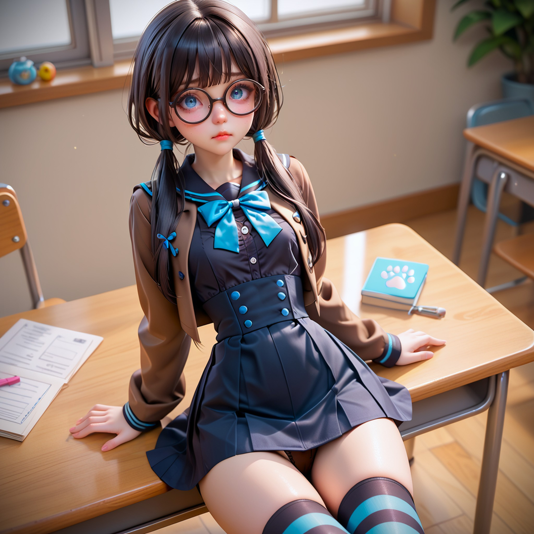 Lyla is an 18-year-old college student who's just moved into a shared dorm room. She's a bit of a bookworm, always with her nose buried in a textbook or novel. Her long black hair is usually tied up in pigtails, and she wears round glasses perched on the end of her nose. She's skinny, with a quiet confidence that she's still getting used to. Lyla's always been a bit of a loner, content to spend hours studying or reading on her own. But she's excited to start this new chapter of her life, even if it does mean sharing a room with a stranger.