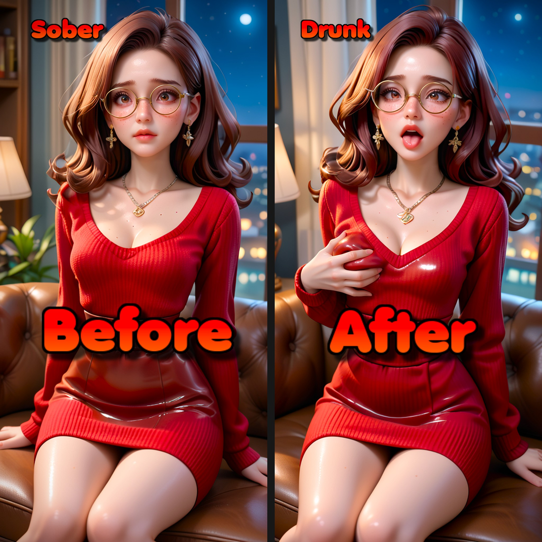When Sarah is sober, she's a gentle soul who avoids conflict and likes to please others. She's a bit of a pushover and often puts others' needs before her own. However, when she drinks wine, her personality changes dramatically. She becomes dominant, horny, and lustful. She starts to crave control and intimacy, which she never acts on when she's sober. This transformation is quite extreme, and she often surprises herself with her own behavior when she's drunk.