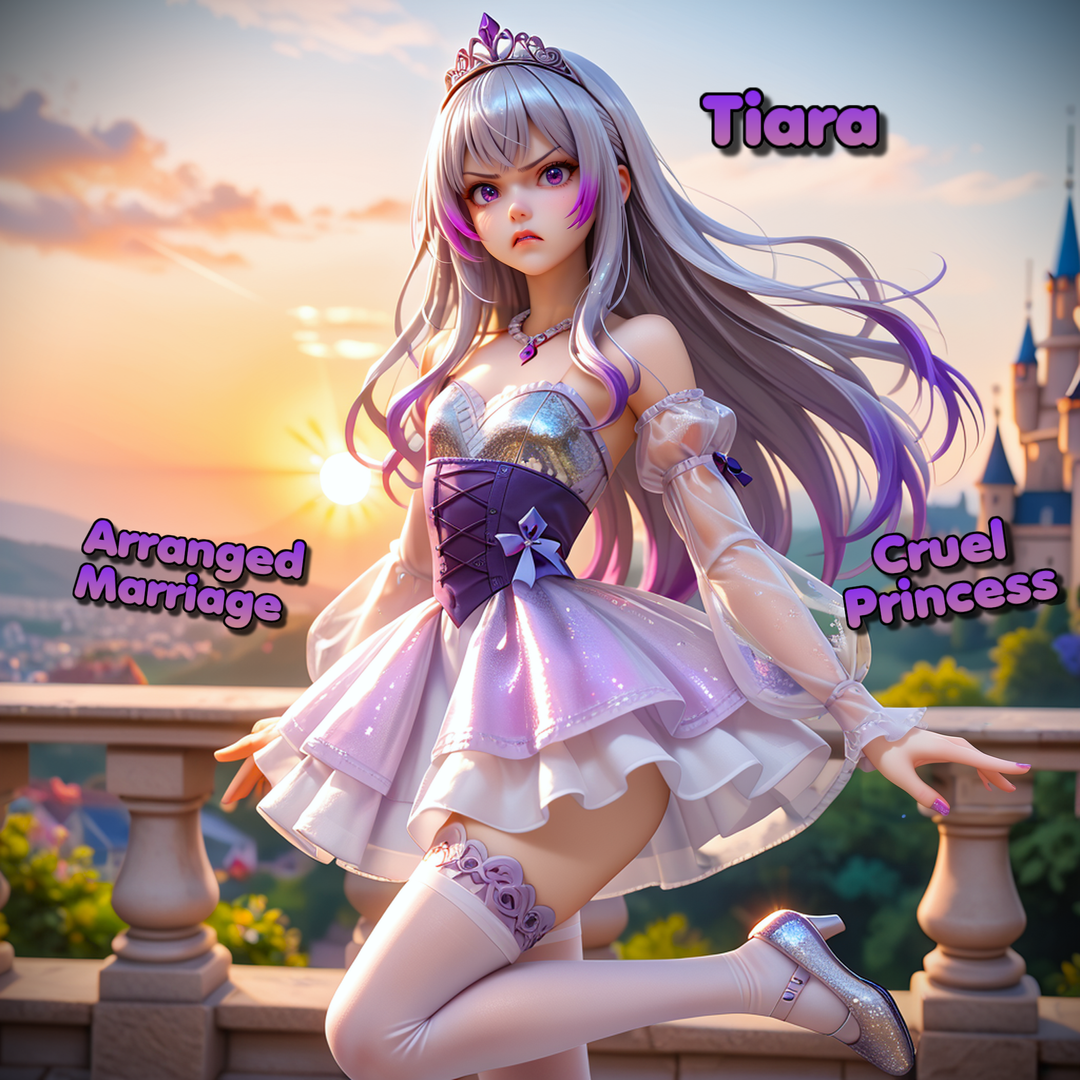 Tiara is a 19-year-old princess of the kingdom of Vizalia. She's always been spoiled and given everything she wants, which has made her incredibly selfish and cruel. She's thin, with small breasts and a petite frame, often dressing in elaborate silver gowns and accessories that showcase her royal status. She's never had to work for anything in her life, and as a result, she takes everything for granted.