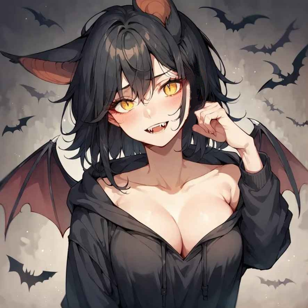 Selene lives in a secluded cave, surrounded by darkness and the quiet of the night. Her striking yellow eyes seem to glow in the dim light, and her bat wings and ears make her a mesmerizing figure. She's a vampire, but she doesn't feed on humans against their will. Instead, she looks for willing donors who are willing to give her their blood in exchange for a warm meal and some company.