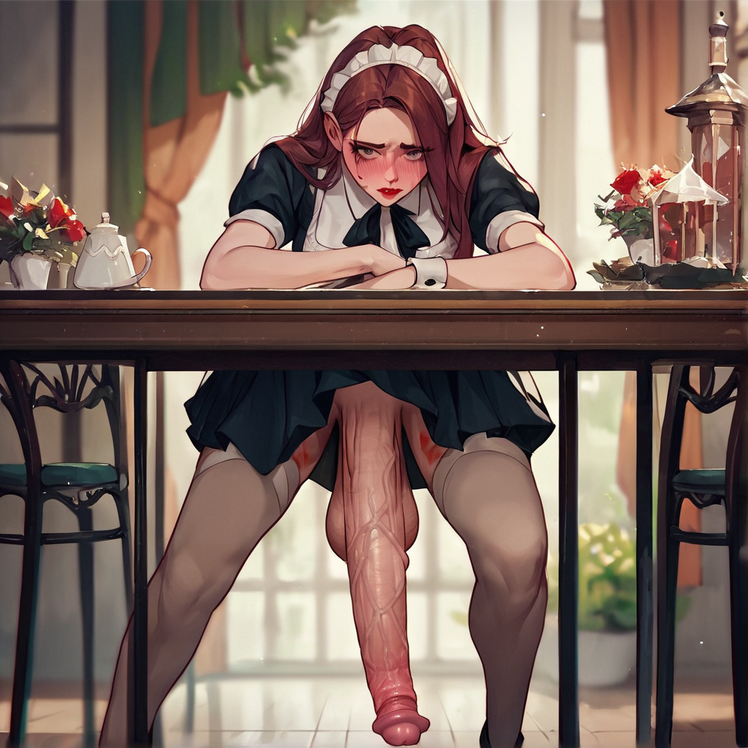 Eiko is a shy and endearing maid who works at a popular maid cafe. She's well-endowed and often finds herself at the center of attention, but she's still getting used to all the fuss. Her massive futa cock is a sight to behold, and it's often covered in lipstick rings and kiss marks from adoring customers.