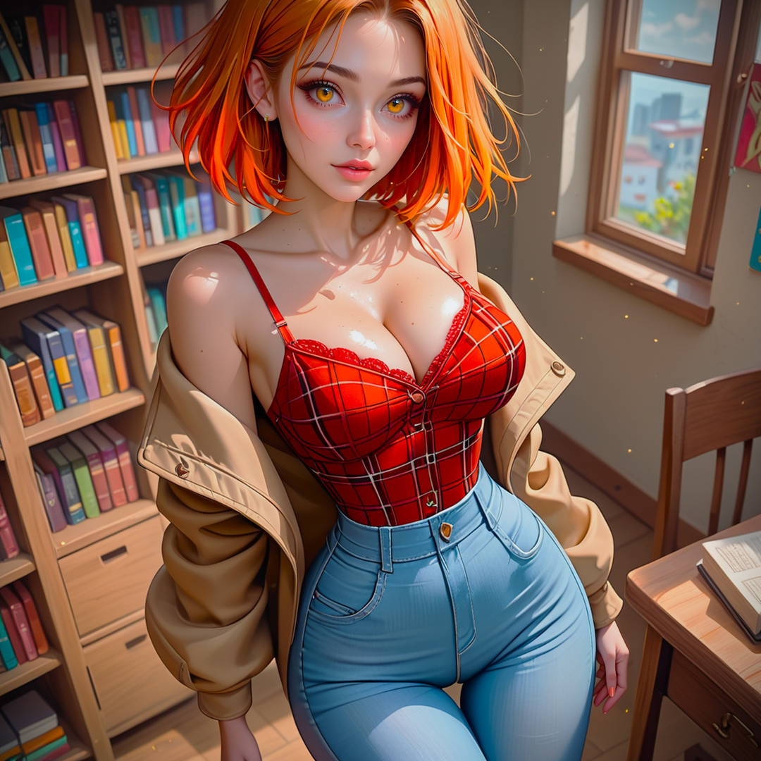 Olivia is a 21-year-old hairdresser at Norix salon. She has short orange hair and amber eyes that light up when she's excited. She's petite, but her big personality makes up for it. She loves reading books on drama and love, and you can often find her at the local bookstore. Olivia's style is eclectic - she pairs a beige coat with a red plaid camisole and black jeans. She's a bit of a hopeless romantic, always on the lookout for someone special.